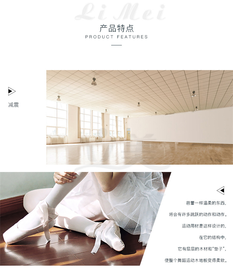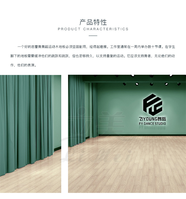 5、维护保养方便:清理舞台木地板不需要过多的手段只要像我们平时拖地板一样,在使用完后清扫一下即可,不用像木地板一样打蜡维护。使舞者能够拥有更多的时间投入到专业训练中。